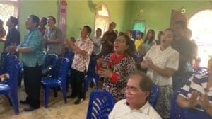 After speaking to a BosNewsLife reporter, he and pastors from the area participate in a happy worship service in Pondaag’s GPdI congregation. Several traveled for hours to reach the GPdI church in humid conditions.